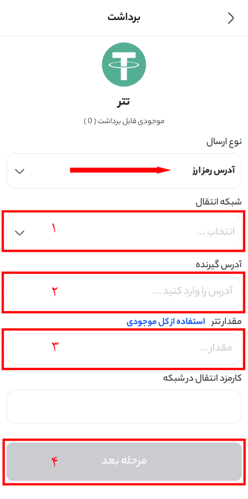 1. برداشت با شبکه انتقال: این روش همانند عملیات واریز رمزارز بوده است. برای برداشت ارز در این روش میبایست یک شبکه انتقال از گزینههای موجود انتخاب نمایید تا عملیات برداشت شما در بستر آن شبکه صورت پذیرد. سپس آدرس کیف پول گیرندهای که میخواهید دارایی به آن حساب منتقل شود را در کادر مربوطه وارد نمایید. و در نهایت بر اساس موجودی کیف پول خود مقدار برداشت را مشخص نمایید.